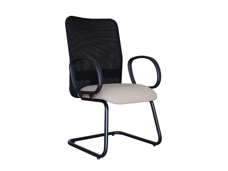 Cadeira fixa Fit com encosto em tela na cor preta e assento estofado e revestido em tecido ou corvim. Com base S e braços fixos tipo corsa.