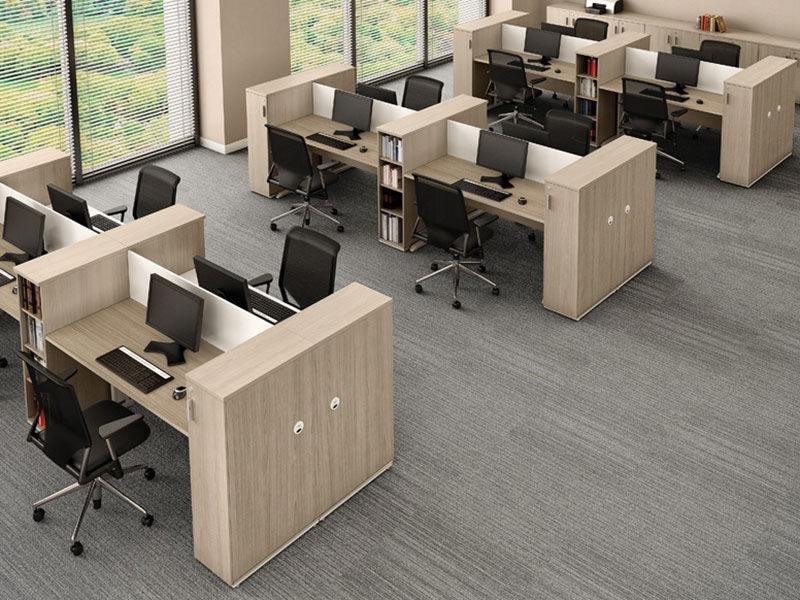 Esta estação de trabalho é composta por mesas e armários. As mesas podem ser em tamanhos variados a partir de 1.00 L e os armários podem vir com prateleiras internas ou suporte retrátil para pasta suspensa. Tampo confeccionado em BP 25mm com fita de borda 2mm, as saias das mesa são confeccionadas em BP 15mm com fita de borda 1mm e os Pés são confeccionados em aço com calha sacável e subida de fiação. Pés com niveladores de altura. Disponível em cores lisas ou amadeiradas.